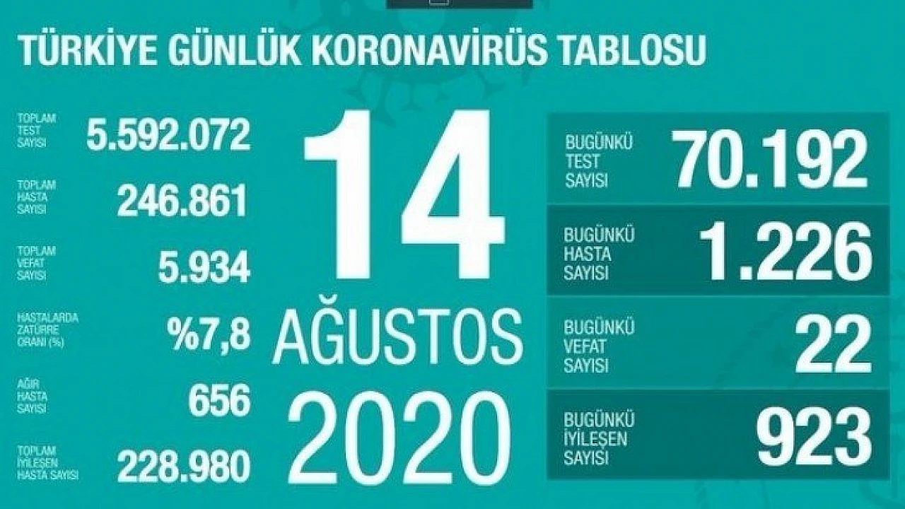 Sağlık Bakanı Fahrettin Koca, sosyal medya hesabından Türkiye’nin güncel korona virüs tablosunu kamuoyu ile paylaştı. Tabloya göre, son 24 saatte 22 kişi korona virüsten hayatını kaybetti, toplam can kaybı ise 5 bin 934’e yükseldi. Bugün toplam 70 bin 192 test yapılırken, bin 226 yeni vaka tanısı konuldu. Toplam vaka sayısı 246 bin 861 oldu. Bugün iyileşen 923 kişiyle birlikte toplam iyileşen hasta sayısı da 228 bin 980’e yükseldi. Toplam hastalarda zatürre oranı yüzde 7,8, toplam ağır hasta sayısının ise 656 olduğu açıklandı.