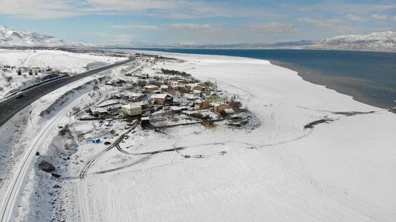 Elazığ’da Keban Baraj Gölü’nün havzasında yer alan Murat Nehri’ne sıfır konumda bulunan Aşağı İçme köyünde suların çekildiği alanların kar yağışı ile beyaza bürünmesiyle eşsiz bir manzara ortaya çıktı.