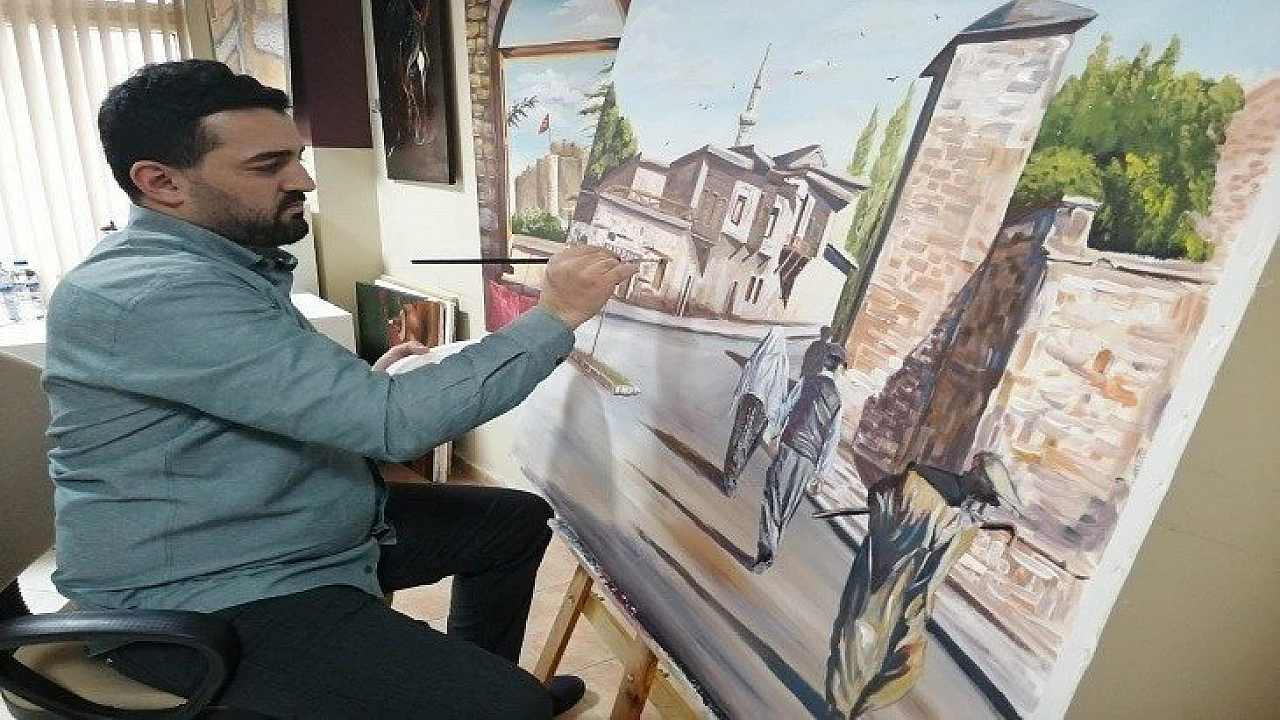 Kendine ait sanat atölyesinde çalışmalarını sürdüren Mehmet Sağlam, Elazığ’ın tarihi mekanlarını ve kültürünü tuvale aktarıyor.
