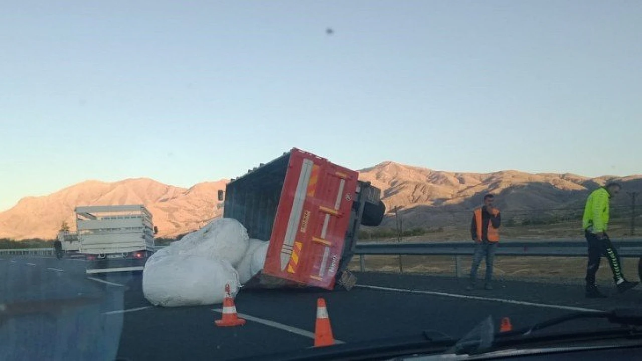Elazığ'da tekeri yerinden çıkan küspe yüklü römork yan yattı, yaralananın olmadığı kazada küspe boş alana devrildi.