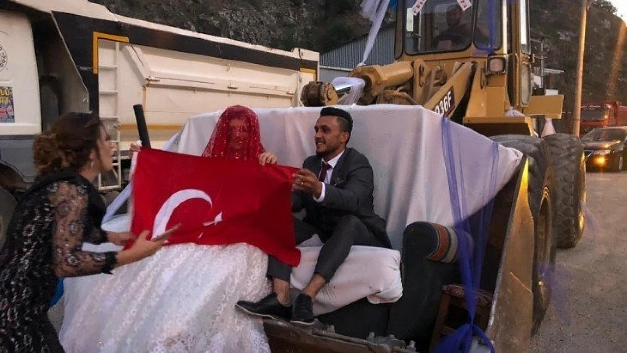 Gümüşhane'nin Torul ilçesinde dünya evine giren iş makinesi operatörü damat, gelini evden kepçeyle alarak şehir turu attı.