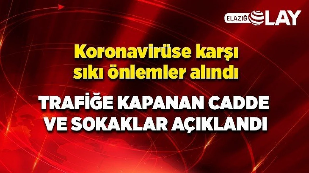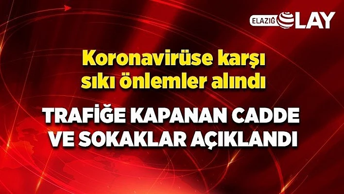 Elazığ Valiliği tarafından vatandaşları koronavirüs salgınından korumak ve yayılmasını engellemek amacıyla il genelinde ilave tedbirler alındı. Alınan tedbirler doğrultusunda, belirlenen cadde ve sokaklar 03 Nisan 2020 Cuma günü saat 11.00 itibariyle Elazığ İl Emniyet Müdürlüğü tarafından trafiğe kapatıldı.