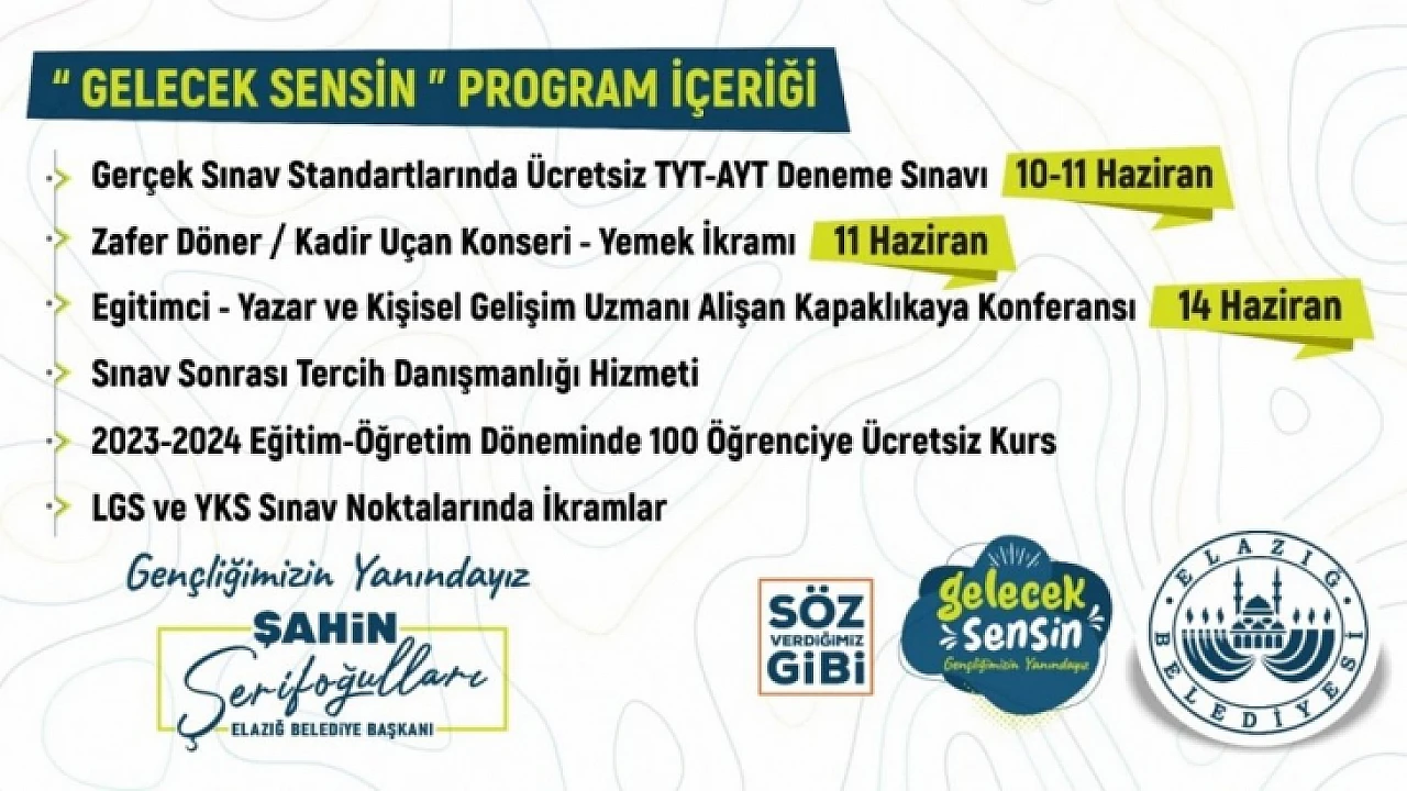 Elazığ Belediyesi tarafından gençlere yönelik eğitime destek çalışmaları kapsamında hazırlanan ücretsiz deneme sınavı, konser, seminer ve sınav sonrası ücretsiz rehberlik hizmetlerinden oluşan "Gelecek Sensin" programı başlıyor. Elazığ Belediyesi Kültür ve Sosyal İşler Müdürlüğü-KURS-DER iş birliğiyle YKS’ye girecek öğrencilere yönelik merkezi sınav öncesi, sınav stresini azaltmak ve gerçek sınav deneyimi sağlamak amacıyla gerçekleştirilecek ücretsiz deneme sınavının birinci oturumu olan TYT 10 Haziran Cumartesi günü saat 10.00’da, ikinci oturumu olan AYT ise 11 Haziran Pazar günü saat 10.00’da yapılacak.