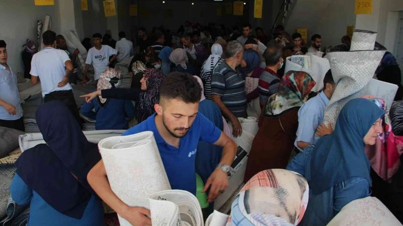 Ucuz halı almak isteyen vatandaşlar birbiriyle yarıştı, kapıda kuyruklar oluştu