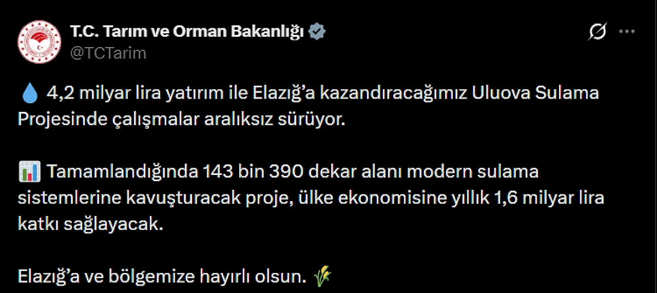 Tarım ve Orman Bakanlığı proje ile ilgili sosyal medya hesaplarından bir paylaşım yaparak: “Elazığ’a ve bölgemize hayırlı olsun.” İfadelerine yer verdi.