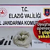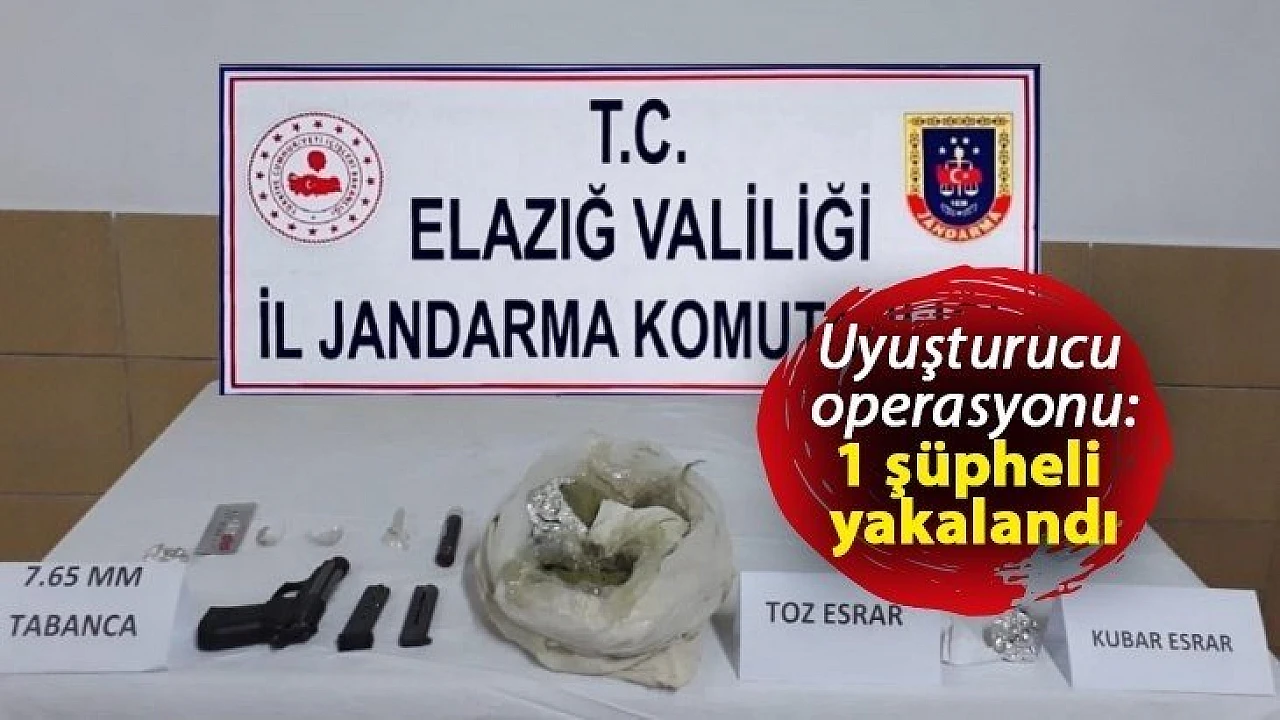 Elazığ'da jandarma ekiplerinin düzenlediği operasyonda 1 şüpheli gözaltına alındı, 1,5 kilogram toz esrarla birlikte çeşitli uyuşturucu maddeler ve 1 adet ruhsatsız tabanca ele geçirildi.