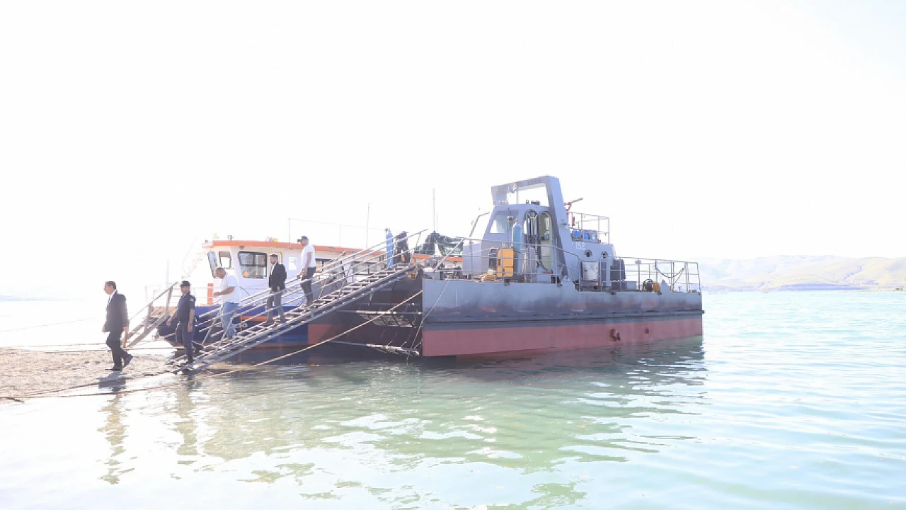 Elazığ Valisi Numan Hatipoğlu'da, Hazar Gölü'nde görev yapacak deniz temizleme aracında incelemelerde bulundu.