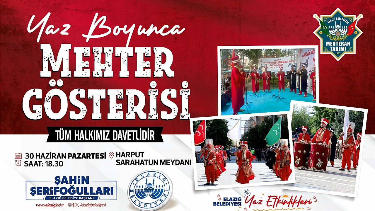 Mehteran konserinin ikincisi 1 Temmuz Pazartesi günü saat 19.00’da Harput Sarahatun Meydanı’nda gerçekleştirilecek. Elazığ Belediyesi Basın-Yayın ve Halkla İlişkiler Müdürlüğü’nden yapılan açıklamada, tüm vatandaşlar etkinliklere davet edildi.